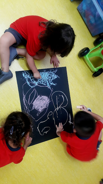 L'altre dia ens vam posar al terra ben còmodes i amb guixos de colors i cartolines negres, vàrem fer uns dibuixos d'allò més creatius .Ens ho vam passar pipa!!